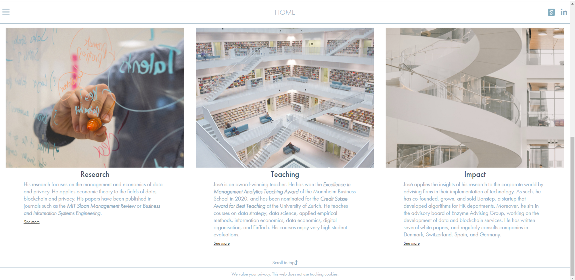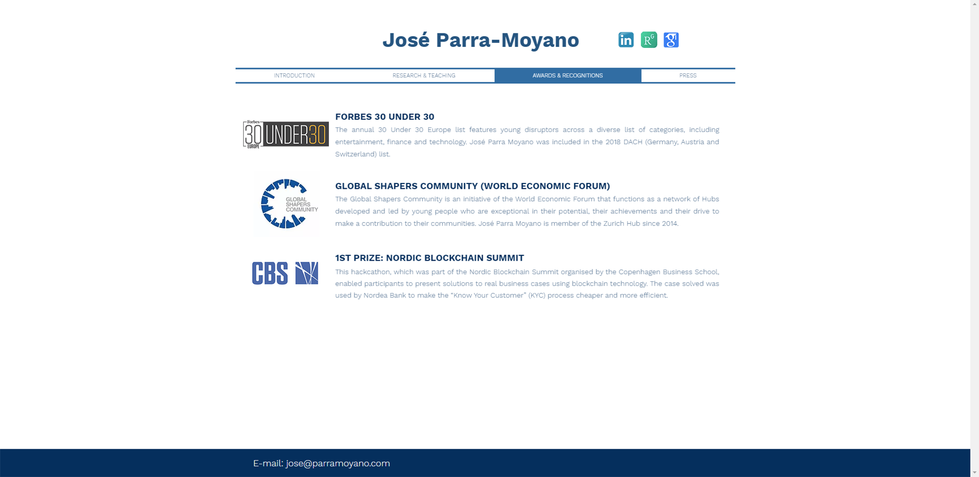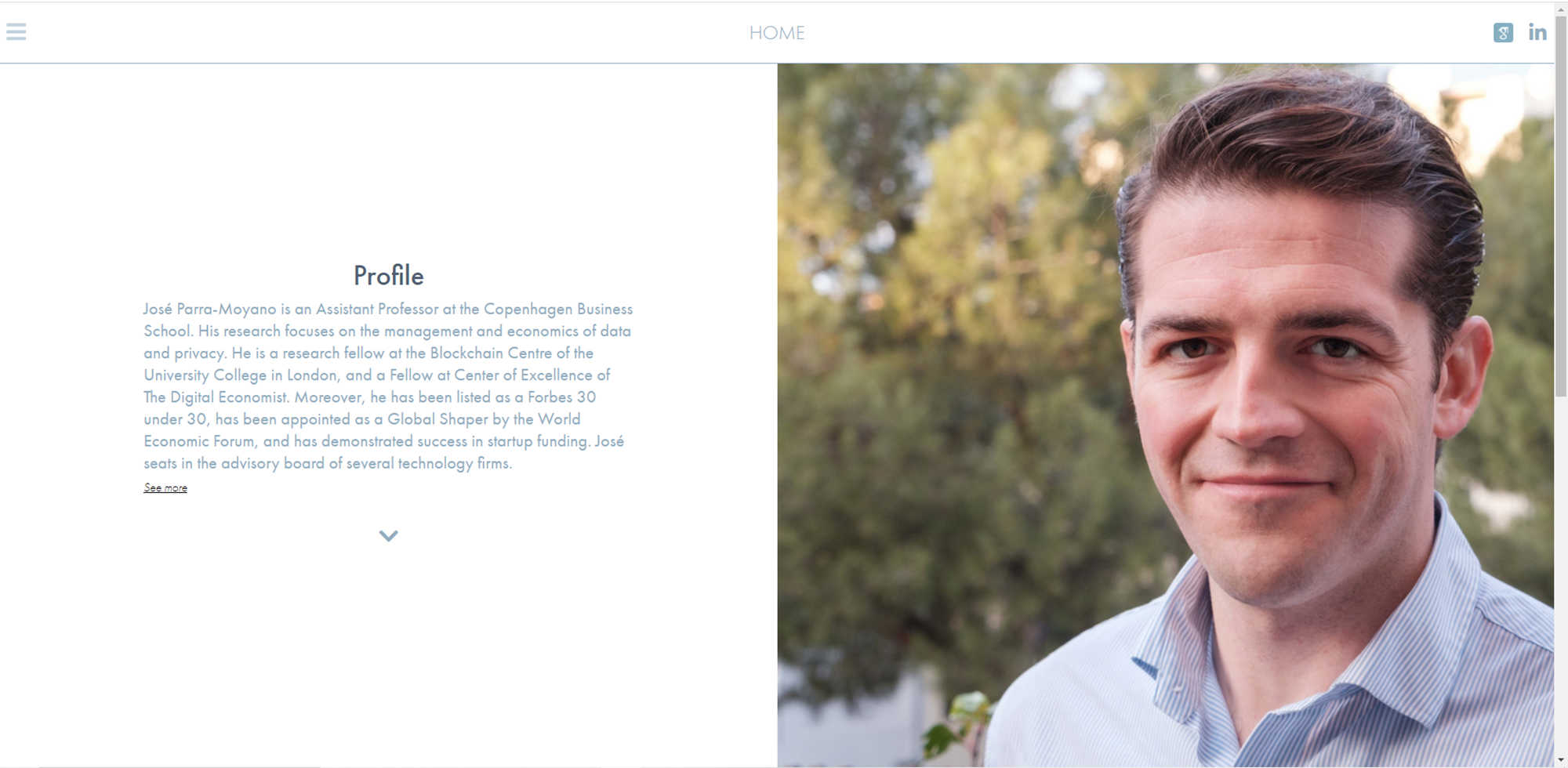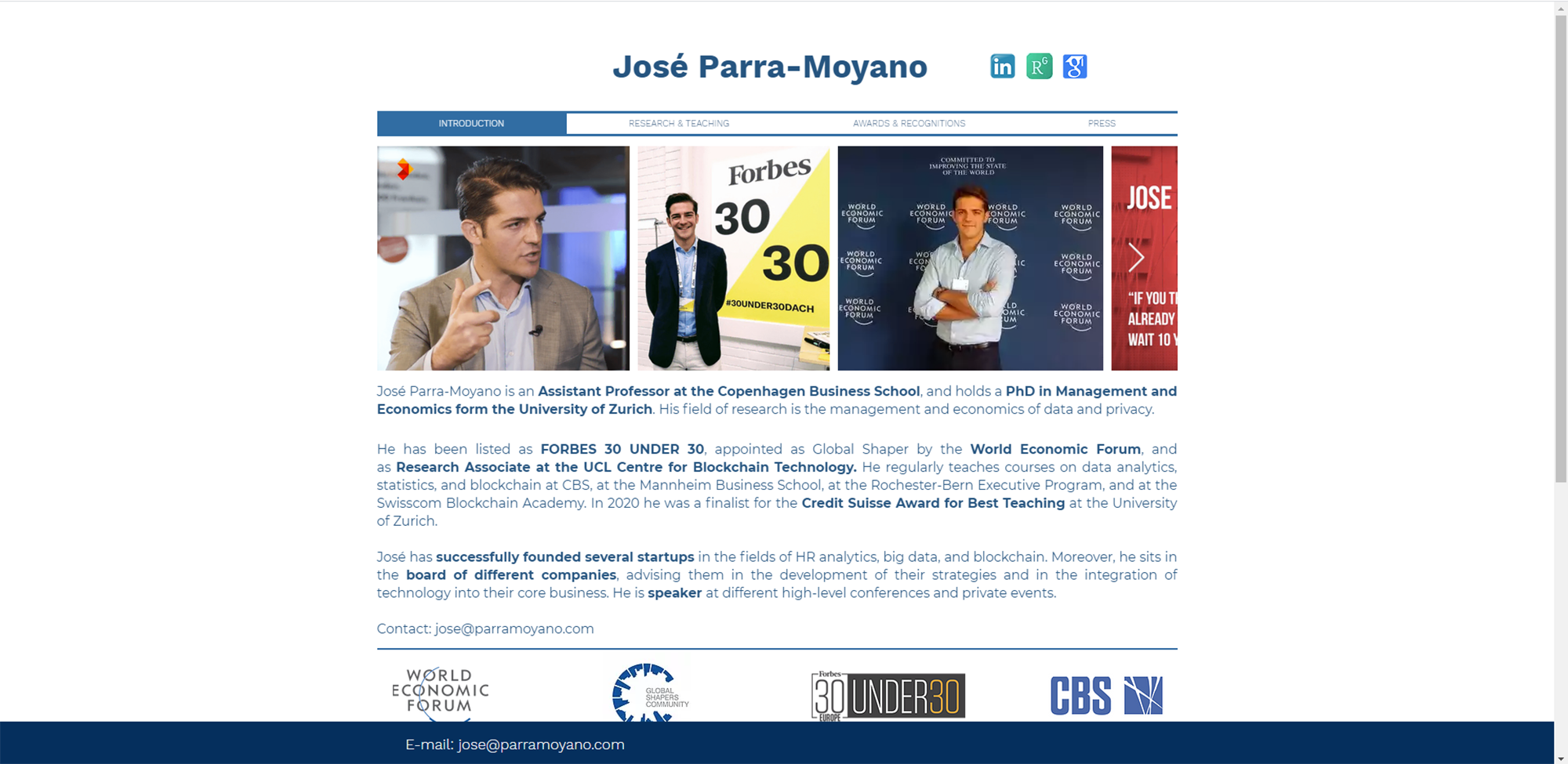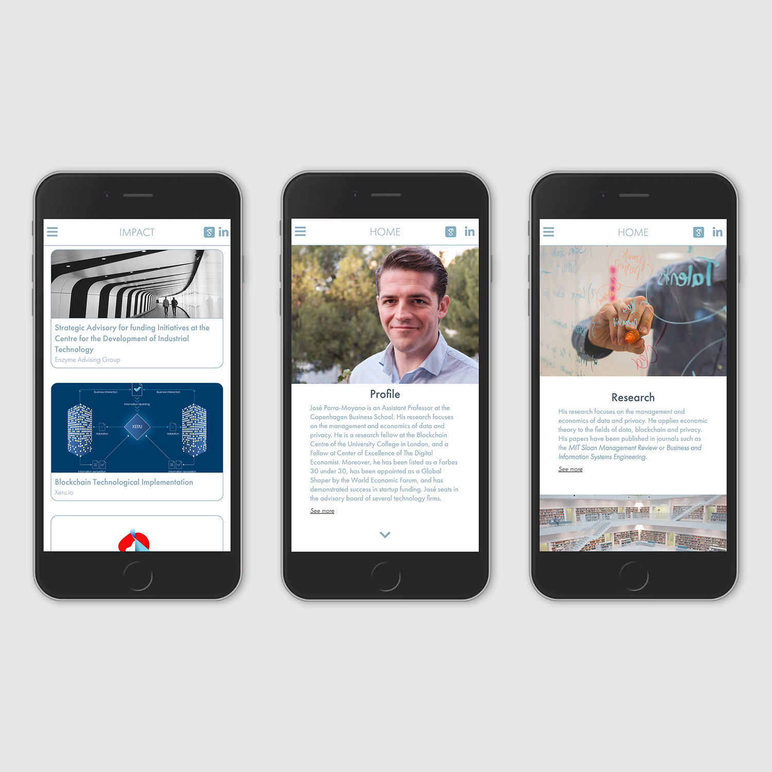 José Parra-Moyano es profesor en la Copenhagen Business School. Ha obtenido la primera plaza de profesor de Blockchain a nivel mundial. Su investigación se centra en la gestión y economía de datos y privacidad. Ha sido escogido Forbes 30 under 30, es Global Shaper del World Economic Forum, fundador de una Startup y consejero en diversas compañías tecnológcicas. Este proyecto consiste en el rediseño de su web anterior, adaptándola no solo a sus necesidades sino también a las de sus clientes objetivos.